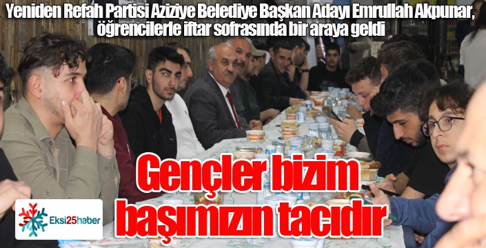 EKSİ25HABER / ERZURUM - Yeniden Refah Partisi Aziziye Belediye Başkan Adayı Emrullah Akpunar gençlerle iftar sofrasında buluştu. " Gençler bizim başımızın tacıdır" diyen Akpunar, iftar sonrası gençlerle uzun uzun sohbet etti.