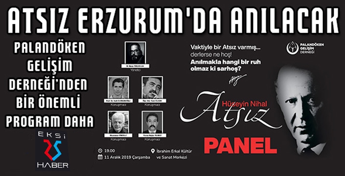 Palandöken Gelişim Derneği tarafından organize edilen ve İbrahim Erkal Kültür Merkezinden 11 Aralık Çarşamba günü saat 19.00'da, Gazeteci Yazar Sinan Özçaylak'ın yöneticiliğinde gerçekleştirilecek Panele, konuşmacı olarak, Eğitim Fakültesi Edebiyat Bölümü Öğretim Üyesi Prof.Dr. Halit Dursunoglu :Ruh Adam romanını, Taş Medrese Yayın Evi sahibi Yunus Buğra Yılmaz :Nihal Atsız ve Türkçülük, Gümüşhane Üniversitesi Edebiyat Bölümü Öğretim Görevlisi Talat Ülker "ATSIZ'IN Türk Tarihçiliğine katkıları ve eserleri, İş adamı Muammer Cindilli: 44 Olayları ve Nihal Atsız konuları hakkında bilgiler verecek.