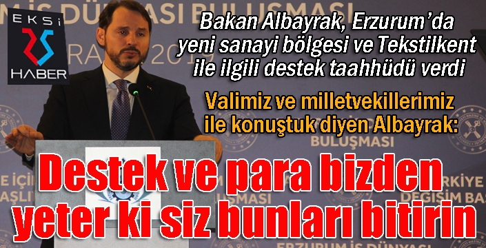 Erzurum'da iş adamlarına seslenen Albayrak, Türkiye’nin son dönemdeki ekonomik saldırılarla başa çıktığını ifade ederek, “Her gün iki ilimiz olmakla birlikte illerimizi ziyaret ediyoruz. Burada hakikaten istiyoruz ki iş dünyamızla sizlerle oturup konuşalım ve sizleri dinleyelim. Gittiğimiz illerde ülkemizin ekonomisine yönelik sizlerin önerilerini alalım. Türkiye’nin değişimi özelinde özellikle gündemdeki meselelerinizin yanında ülkemizin ekonomisine dair öneri alalım. Bu değişim dönüşümün faydalarını sizlerle paylaşalım. Malumunuz ülkemiz ekonominin her alanında büyük bir potansiyele sahip bir ülke. Son 17 yılda bu potansiyeli zaman zaman harekete geçirsek de ülkemizin karşı karşıya kaldığı sınamalarla bu süreçler dönem dönem kesintiye uğradı. Son 6 yıldır Gezi'yle başlayan olaylar, darbe girişimi, terör olaylarıyla Türkiye fiili bir savaş altında bıraktı. Özellikle son dönemdeki tüm bu ekonomik saldırılar da dahil olmak üzere tüm bu saldırmalarla başa çıktı. Artık yeni bir dönem Türkiye ekonomisini harekete geçirme zamanı. Türkiye’nin potansiyelini bir daha kesintiye uğramayacak şekilde harekete geçirmeye çalışacağız. Erzurum, bizim bir ve beraber olduğumuz zaman kenetlendiğimiz zaman neler yapabileceğimizi en iyi bilen kentlerden birisi. Büyük ve güçlü Türkiye ideali için omuz omuza kilitleniyoruz. Erzurum ekonomisini geliştirmek için valimiz ve milletvekillerimiz ile konuştuk. Yeni sanayi bölgesi ve Tekstilkent ile ilgili biz hepsine destek vermenin taahhüdünü veriyoruz. Destek ve para bizden yeter ki siz bunları bitirin” şeklinde konuştu.