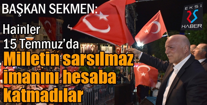 Büyükşehir Belediye Başkanı Mehmet Sekmen, aklını ve beynini şeytana kiralamış olan bir avuç üniforma hırsızının, 15 Temmuz’da milletin iradesine pranga vurmaya çalıştığını kaydederek, “Buna kalkıştılar ama aziz milletimizin karşılarına sarsılmaz bir imanla çıkacağını hiç hesaba katmadılar. Uçaklarla, tanklarla, bombalar ve silahlarla halkın üzerine ölüm kustular ama bu necip milletin şehadet uğruna değil bir can, bin canı bile olsa gözünü kırpmadan verebileceğini o kiralık akıllarına getirmediler. Onlar Çanakkale’de kursaklarına dizdiğimiz heveslerini 15 Temmuz’da yeniden yaşamak istediler ama efsunlu ve dualı bu milletin her bir evladının aslında birer Seyit Onbaşı ve birer Nene Hatun olduğunu nedense çok çabuk unuttular. O gece bu satılmış FETÖ hainleri bozguna uğradılar, hezimeti yaşadılar ve o gece yurdun dört bir yanında oluşan çelikleşmiş iman gücümüzün etkisiyle yok oldular” diye konuştu.