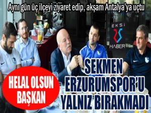 Aynı zamanda B.B. Erzurumsporun Onursal Başkanı olan Büyükşehir Belediye Başkanı Mehmet Sekmen, Kulüp Başkanı Hüseyin Üneşle birlikte kampta ziyaret ettiği mavi beyazlı ekiple daha sonra sabah kahvaltısında bir araya geldi. Teknik Direktör Hamza Hamzaoğlundan kamp çalışmaları hakkında bilgiler alan Başkan Sekmen, takımdaki moral ve motivasyonun yüksek oluşunu görmekten duyduğu memnuniyeti ifade etti. Başkan Sekmen, Erzurumsporun Süper Lige yeni çıkmış bir takım olmasına rağmen ortaya bir tarz koyduğunun altını çizerek, Takımımız Türk futbol kamuoyunun bir numaralı gündem maddesi haline geldi. Bugün önde gelen yorumculardan futbol otoritelerine varıncaya kadar herkes Erzurumsporu konuşuyor, mavi beyazlı renklere gönül vermiş olan Erzurumspor taraftarını konuşuyor, Erzurumu konuşuyor. Bu anlamda hiçbir takım Erzurumspor kadar ayrıcalıklı ve özel değil şeklinde konuştu.
