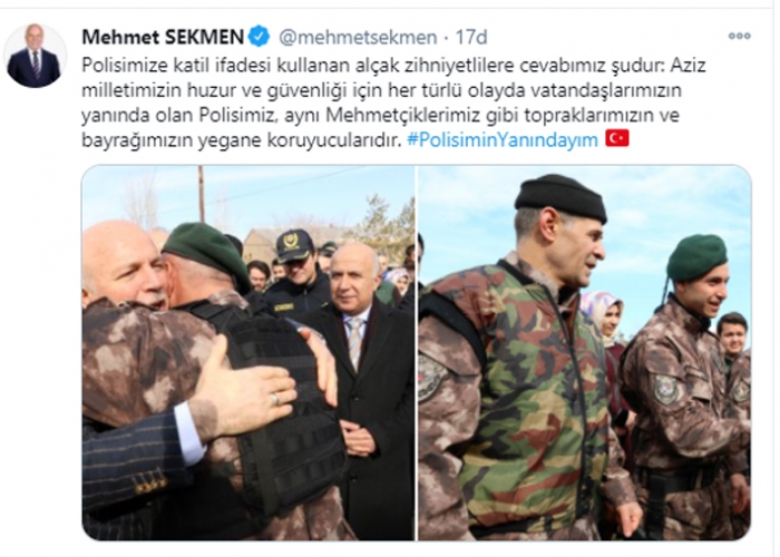 EKSİ25HABER / ERZURUM - Erzurum Büyükşehir Belediye Başkanı Mehmet Sekmen, Boğaziçi Üniversitesi'de ''Katil Polis'' sloganı atanlara sosyal medya hesabından tepki gösterdi. Sekmen ''Polisimiz aynı mehmetçiğimiz gibi topraklarımızın ve bayrağımızın yegane koruyuculardır' dedi.
