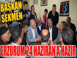 AK Parti yatırımlarını vatandaşlara anlatan Başkan Sekmen, Erzurum 24 Hazirana hazır dedi. İspirden Çata, Şenkayadan Hınısa kadar adım atmadık yer bırakmayan Başkan Sekmen, Erzurumun 24 Haziran seçimlerini sabırsızlıkla beklediğini ifade etti. AK Belediyecilik şiarıyla bugüne kadar Erzuruma yapılmayan yatırımları kazandırdıklarını belirten Başkan Sekmen, Prestij caddeleri, fuar alanı, mesire alanları, merkez ve mahalle yollarında yapılan iyileştirmeler, kentsel dönüşüm, Yüksek İrtifa Kamp Merkezi ve daha birçok yatırımı Erzuruma kazandırmanın mutluluğunu yaşıyoruz. Cumhurbaşkanımız Sayın Recep Tayyip Erdoğanın bu şehre olan sevdasını anlatmaya gerek yok. Bu projelerin tümü Cumhurbaşkanımızın talimatlarıyla gerçekleştirildi dedi.