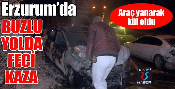 EKSİ25HABER / ERZURUM - Erzurum’da buzlanan yolda kontrolden çıkan araç, önce önündeki araca ardından aydınlatma direğine çarptı. Kazanın etkisiyle alev alan araç yanarak kül olurken, kazada öndeki aracın sürücüsü ve oğlu yaralandı.