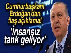 Savunma sanayinde milli ve yerli üretime dikkat çeken Erdoğan, 2002 yılında ülkemizde 66 savunma projesi yaklaşık yüzde 20 yerlilik oranı ile yürütülüyordu, 2017 yılında 600 projeyi yüzde 65in üzerinde yerlilik oranı ile sürdürür hale geldik. Afrinde zırhlı taşıyıcılarımız var ya, neredeyse bunların tamamına yakını yerli. Artık bizim silahlı insansız araçlarımız var ya, yıllarca biz stratejik ortağımızdan bunları istedik, aldığımız cevap şuydu, kongre müsaade etmiyor. Siz bunu başkalarına veriyorsunuz, ben senin stratejik ortağın değil miyim, biz NATOda beraber değil miyiz, niye bize vermiyorsun? Şartları zorluyoruz ama vermiyor, olsa olsa biz bunu size belirli sürelerle kiralayalım. Hani bir söz var ya kötü komşu ev sahibi yapar diye. Bu kötü sahibi komşular bizi en sonunda silahlı ve silahsız insansız hava aracı sahibi yaptılar. Şimdi bu aracı üreten dostlarımıza, arkadaşlarımıza milletim adına teşekkür ediyorum. Bu olay sıradan bir olay değil. Bunu biz kendimiz üretiyor olmasaydık, bir tane insansız hava aracımız düşse ne olur diye düşünürdük, şimdi düşünmüyoruz. Düşürürseniz düşürün, ikincisi de var, üçüncüsü de var, dördüncüsü de var. Geçen bir helikopterimiz düştü yandık, yakıldık. 2 tane pilotumuz gitti, üzüldük. Hemen oradaki bu sistemlerin sorumlusu olan arkadaşımızın söylediği şu, Cumhurbaşkanım biz üzülüyoruz, insansız hava aracında insan yok ki düşerse düşer. Biz niye bazı şartlarda da onları uçurmuyoruz. Onları uçuralım, vursunlar o düşsün ama hiç olmazsa benim pilotum şehit olmaz. Şimdi biz buraya geldik. Şimdi bunu daha ileriye taşıyacağız. Şimdi öyle bir yere gelmemiz lazım ki biz insansız tankları da üretir hale gelmemiz lazım ve bunu da yapacağız diye konuştu.