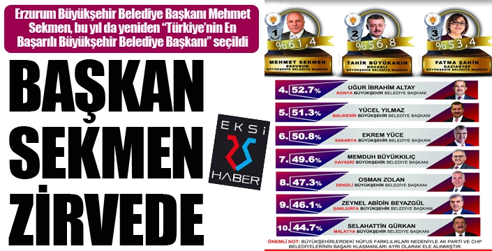 EKSİ25HABER / ERZURUM - Yerel yönetimde Türkiye’ye adeta rol modeli olan Erzurum Büyükşehir Belediye Başkanı Mehmet Sekmen, bu yıl da yeniden “Türkiye’nin En Başarılı Büyükşehir Belediye Başkanı” seçildi.