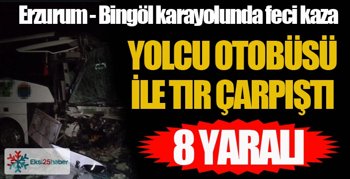 EKSİ25HABER / ERZURUM - Alınan bilgilere göre kaza, Karlıova kara yolunun Boncukgöze köyü mevkisinde meydana geldi. Kar ve tipinin etkili olduğu bölgede sürücüleri öğrenilemeyen yolcu otobüsü ile tır çarpıştı. Haber verilmesi üzerine kaza yerine jandarma, sağlık ve itfaiye ekipleri sevk edildi. İlk belirlemelere göre kazada yaralanan 8 kişi, ambulanslarla Karlıova Devlet Hastanesi’ne sevk edildi.