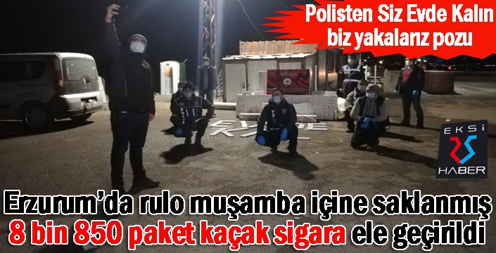 EKSİ25HABER / ERZURUM - Erzurum’da polis kontrol noktasında durdurulan bir Tırda rulo halde sarılmış olan muşambaların içerisinde piyasa değeri 116 bin 750 lira olan 8 bin 850 paket kaçak sigara yakalandı. Polis ekipleri ele geçirdikleri sigaralarla “Evde Kal” yazarak öz çekim yaptı.