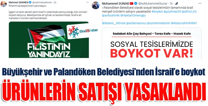 Palandöken Belediye Başkanı Muhammet Sunar ise yaptığı açıklamada, ''Palandöken Belediyesi olarak Sadabat Aile Çay Bahçesi, Teras Kafe ve Hızzek Kafede İsrail menşeli ürünlerin satışını yasakladık!'' ifadelerina yer verdi.