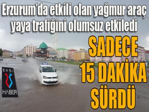 Erzurumda öğle saatlerinde etkili olan ve yaklaşık 15 dakika süren sağanak yağış, araç ve yaya trafiğini durma noktasına getirdi. Yağmura hazırlıksız yakalanan yayalar, otobüs durakları ve kapalı alanlarda korunmaya çalışırken, araçlar trafikte seyretmekte güçlük çekti. Cadde ve sokaklarda oluşan su birikintileri vatandaşlara zor anlar yaşattı.
