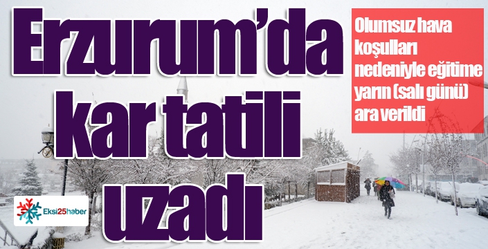 EKSİ25HABER / ERZURUM - Erzurum'da olumsuz hava koşulları nedeniyle eğitime birgün daha ara verildi. Erzurum Valiliği olumsuz hava koşulları nedeniyle yarın (Salı Günü) Yakutiye Palandöken ve Aziziye ilçelerinde eğitime ara verildiğini bildirdi.