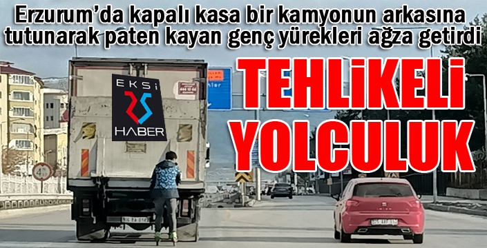EKSİ25HABER / ERZURUM - E-80 karayolu üzerinde seyir halindeki kapalı kasa bir kamyonun arkasına tutunan patenli genç, görenlerin yüreklerini ağza getirdi. Yaklaşık 2 kilometre kamyonla birlikte ilerleyen genç, sürücülerin uyarı kornolarına kulak asmadı.