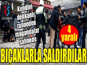 EKSİ25HABER / ERZURUM - Olay, bugün öğle saatlerinde Erzurum'da vatandaşların en yoğun olduğu Cumhuriyet Caddesi Çaykara İş Merkezi önünde meydana geldi. Edinilen bilgiye göre, daha önceden aralarında husumet bulunan gençler Çaykara İş Merkezi önünde karşı karşıya geldi. 'Sallama' diye tabir edilen döner bıçaklarıyla birbirlerine saldıran gençler dehşet dolu anlar yaşattı. Olayı görerek gençlere müdahale etmeye çalışan bir kadın gözünün önünde birisinin bıçaklandığını görünce şoka girerek bayıldı. Çok sayıda polisin müdahale ettiği olayda 4 genç bıçaklanarak yaralandı. Polis güç kullanarak kavgacı gençleri etkisiz hale getirdi ve kelepçeleyerek polis otosuna bindirdi. Yaralanan 4 kişi ambulansla hastaneye kaldırıldı. Onlarca insanın gözü önünde yaşanan korku dolu anlar kameralara saniye saniye yansıdı.
