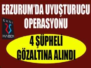 EKSİ25HABER / ERZURUM - Emniyet Genel Müdürlüğü Narkotik Suçlarla Mücadele Dairesi Başkanlığı koordinesinde Türkiye genelinde uyuşturucu operasyonu başlatıldı. Erzurum'da da düzenlenen operasyonda 4 şüpheli gözaltına alındı.