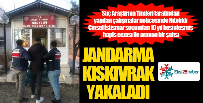 Konu ile ilgili yapılan açıklamada, "Elde edilen bilgi Cumhuriyet Savcısı ile paylaşılmış, alınan arama kararı ile söz konusu şahıs 13 Mart 2025 günü yakalanarak adli makamlara sevk edilmiş, tutuklanmasını müteakip Hınıs Kapalı Ceza İnfaz Kurumuna teslim edilmiştir. Erzurum İl Jandarma Komutanlığınca, vatandaşlarımızın can ve mal güvenliğinin sağlanması maksadıyla, ilgili mevzuatın verdiği görev, yetki ve sorumluluklar çerçevesinde emniyet ve asayiş görevlerinin yerine getirilmesine kararlılık ve azimle devam edilecektir" denildi.