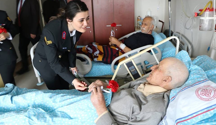 Jandarma personeli hastalara geçmiş olsun dileklerini iletirken, çocuklara oyuncak hediye büyüklere karanfil dağıtıp sohbet ettiler.