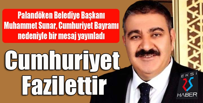EKSİ25HABER / ERZURUM - Palandöken Belediye Başkanı Sunar, “Cumhuriyet, Türk Milletinin uğruna can adadığı bir değer; Türkiye, sınırları şühedanın aziz kanıyla çizilmiş mübarek bir coğrafyadır. Milli birliği, kardeşliği, huzur ve istikrarıyla cihana yön veren Türkiye, 2023 hedefine emin bir istikamette ilerlemektedir.” dedi.