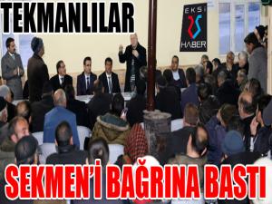 Seçmenlerin büyük ilgisiyle karşılaşan ve Tekmanlılarla adeta bütünleşen Büyükşehir Belediye Başkanı Mehmet Sekmen, Erzurumun dünü ile bugünü arasında bir mukayese yaptı. Şehrin dört bir yanında gelişim ve kalkınma yollarının açıldığının altını çizen Başkan Sekmen, Düne kadar hayalini bile kuramadığımız yatırımları hamdolsun bizler gerçekleştirdik, gerçekleştiriyoruz. Erzuruma Türkiyenin en büyük kamu yatırımı olan Et Entegre Tesislerini kurduk; Tekmanlı kardeşlerimiz hayvancılık yapsınlar, üretsinler, kazansınlar diye. Bölgemizin en büyük canlı hayvan borsasını yaptık, bitirdik. Buralar hepimiz için, kazanmamız için. Ahırımızdaki hayvanlarımızın değerini bulması için. Biz attığımız her adımda insanımızı düşündük, Tekmanlı kardeşimizi düşündük, Hınıslı, Karaçobanlı ve Karayazılı kardeşimizi düşündük şeklinde konuştu.