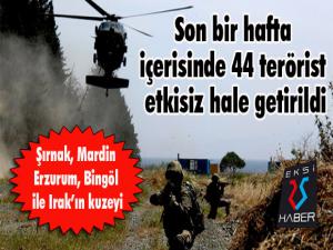 EKSİ25HABER / ERZURUM - Türk Silahlı Kuvvetleri, son bir hafta içerisinde gerçekleştirilen operasyonlarda yurt içinde 30 ve yurt dışında 14 olmak üzere toplam 44 teröristin etkisiz hale getirildiğini açıkladı.