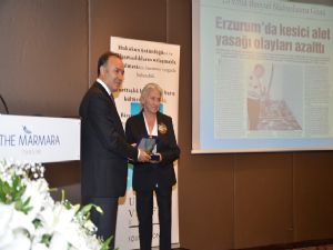Erzurum Valisi Dr.Ahmet Altıparmak'a plaketi Umut Vakfı Başkanı Nazire Dedeman Çağatay takdim etti.